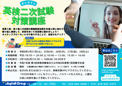 令和7年度第3回英語検定3級および準2級受験者を対象にした、オンライン講座を実施するそうです。詳細は以下のとおりです。