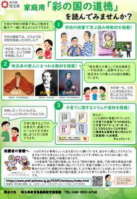 埼玉県では、家庭用「彩の国の道徳」について、県ホームページに電子版・家庭用「彩の国の道徳」を掲載し、家庭と学校が同じ視点に立ち、子供たちの豊かな心を育めるように、全ての家庭で活用していただけるようにしています。