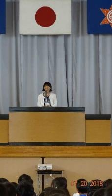 校長先生の式辞の前半は1学期の振り返りでした。あいさつが向上してきたことや学習規律の大切さについてのお話がありました。後半では、夏休みに向けて3つのよいこと、「体」によいこと、「頭」によいこと、そして「人のため」によいことを進んでしようというお話でした。特に3つめでは、甚大な被害がでた「西日本豪雨」の被災地では、多くのボランティアが頑張って被災した人たちの大きな助けになっているお話もありました。