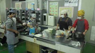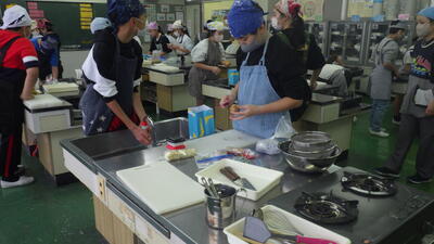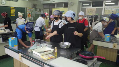 6年1組は、1時間目から調理実習に取り組んでいます🍴