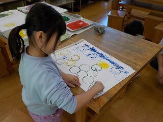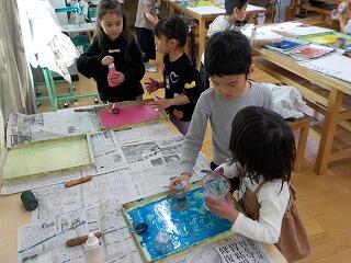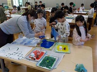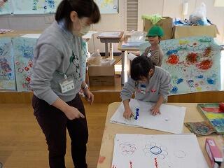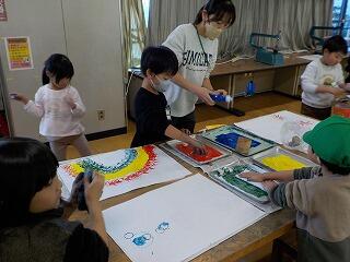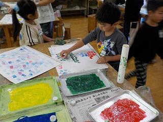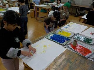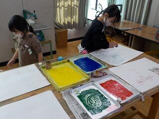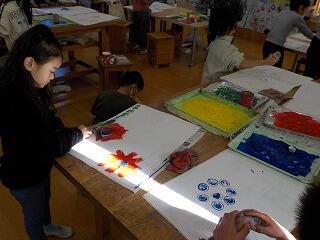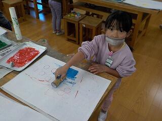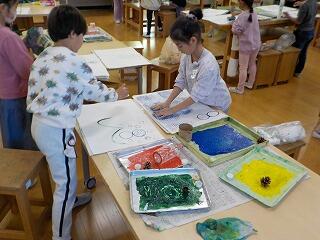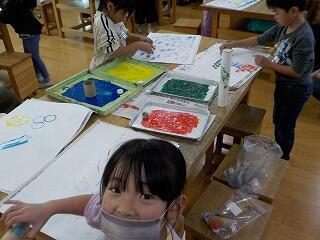 1年生が図工室で、お家から集めて持ってきた材料(トイレットペーパーの芯やペットボトルキャップなど)を使って、スタンプ遊びをしています😊自分の好きな色を選んでから材料に付け、白いキャンバスに描いていきます🎨
