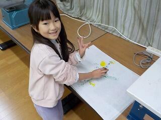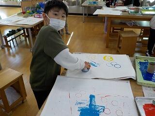 「いろいろな形を組み合わせてみる」ことも楽しい学習なので、絵の具の色や、スタンプの形など、まだまだ幅が広がってきそうな雰囲気です😁