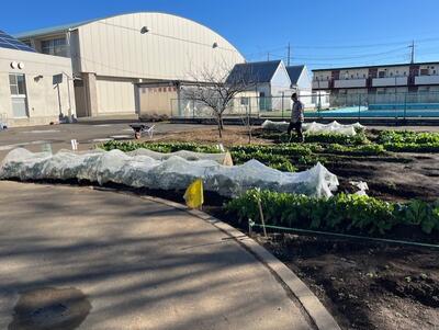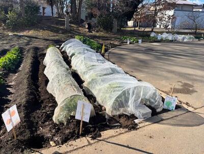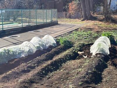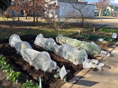 スタートから畑を支援してくださっている先生にも助言をいただき、白菜、キャベツ、ブロッコリー、カリフラワー、などに寒冷紗(かんれいしゃ)を設置しました💡「トンネルがけ」という 支柱をアーチ状に立て、その上から寒冷紗をかけてトンネルのように覆う方法で作物をカバーしました🙂