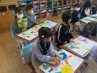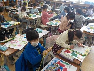 2年3組では、図工「たくさん うつそう わたしの形」の仕上げに作品カードづくりを行っていました✏️