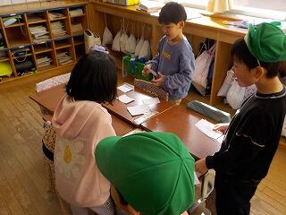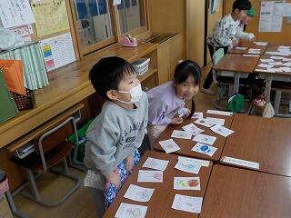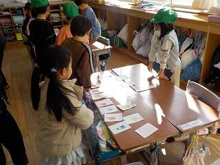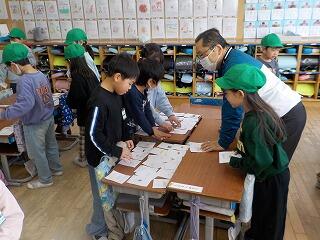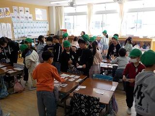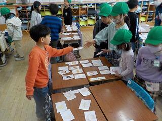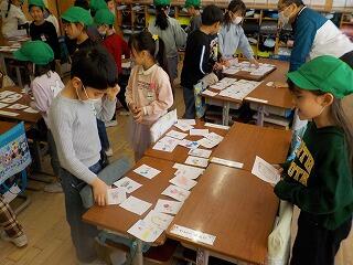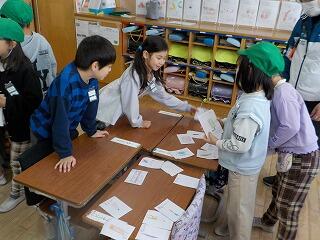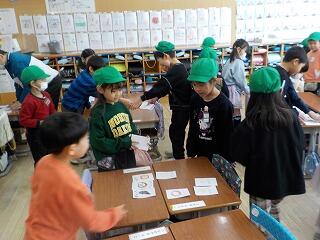 1年2組が、国語「ものの名まえ(おみせやさんをひらこう)」で班ごとに自分達で作成したカードについて、売り買いしています😁