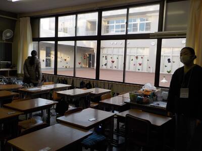 ② 鉄筋校舎2F教材室の外側窓にもカーテンを設置する(新校舎側見える為)。
