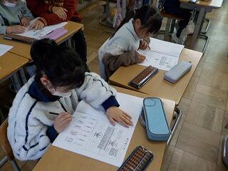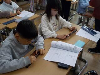 3年2組には、習い事で「そろばん」をやっている子が一人いましたね🙂基本的な「そろばん」の扱い方も初めてだと難しいものですね😀