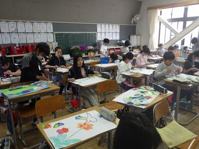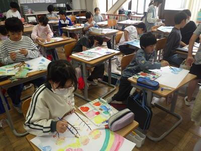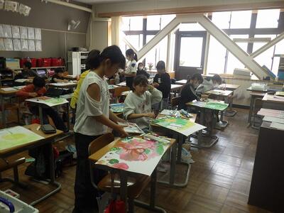 5年1組、2組では、季節を感じる絵を仕上げていました。