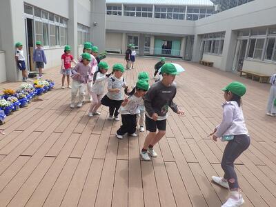 休み時間は、雨上がりで、校庭が使えないため、ウッドデッキで2年生が元気に長縄で遊んでいました。