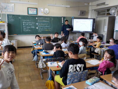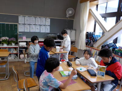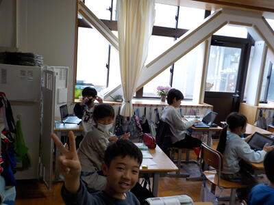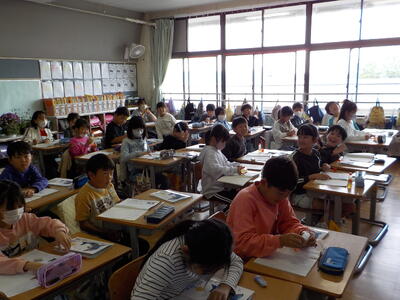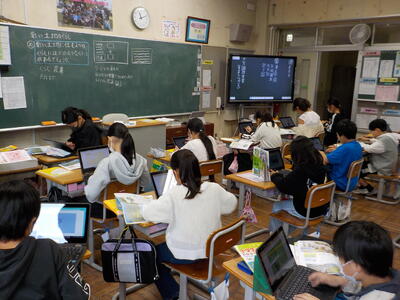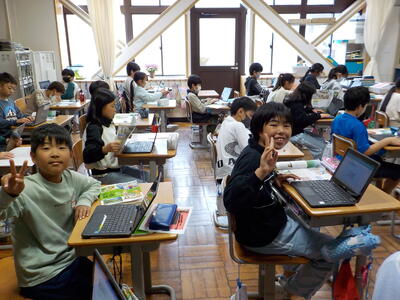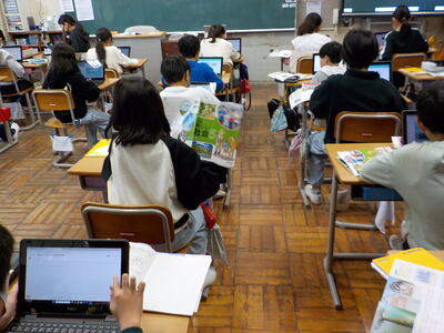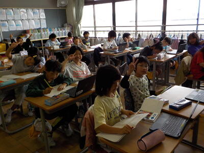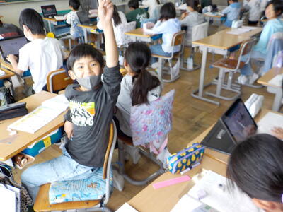 5年3組では、社会科の水害について、オクリンクやノートを使ってまとめていました。昔の人々の工夫によって、水害対策が数多く取られることによって、輪中のくらしが成立していることをまとめていました。