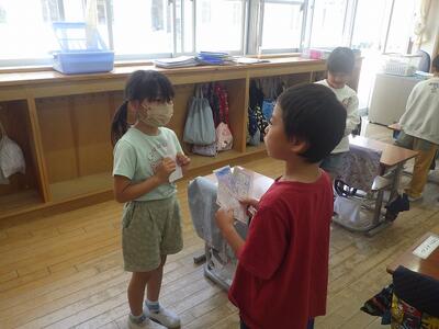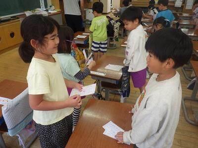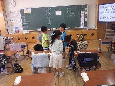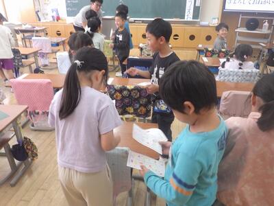 1年生は、名刺交換をして、好きなものを互いに伝え合っていました。「3枚も集まったよ」「先生は、ラーメン好き?」