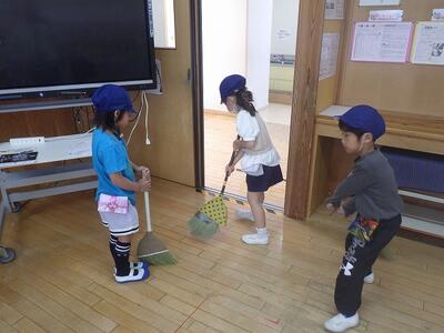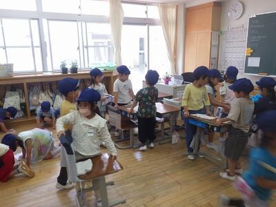 別の学級では、そうじのやり方の学習です。後ろに下がりながら雑巾を掛けたり、二人で机を運んだりと、自分たちでできるように学んでいました。本校は「」助け合い清掃」を行っています。互いに助け合いながら、掃除を進められるといいですね。👍