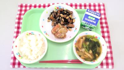 11/11 今日の給食😃 投稿: 吹上小 (11/11) 今日の給食は、ごはん、牛乳、ねぎ塩チキン、大豆の磯煮、小松菜のみそ汁でした。 揚げた鶏肉に、ねぎ、ごま油、レモン汁、塩こしょう、砂糖を合わせて作った給食室特製のねぎ塩ソースをかけました😊 -