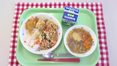 今日の給食は、油麩丼、つぼ漬け、牛乳、豚汁でした。