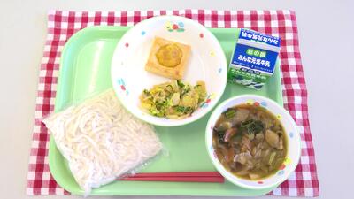 今日の給食は、ねぎまうどん、牛乳、はくさいと水菜のサラダ、いもきんとんパイでした。