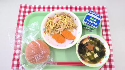 今日の給食は、こどもパン、牛乳、塩焼きそば、チキンナゲット、わかめスープでした。