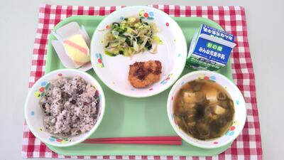 今日の給食は、赤飯、牛乳、ヒレカツ、もやしとほうれん草のおひたし、豆腐のみそ汁、いちごのお祝いケーキでした。