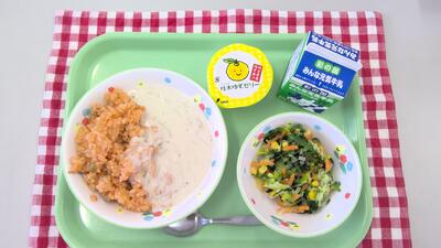 今日の給食は、チキンライスのホワイトソースかけ、牛乳、ほうれん草サラダ、埼玉県産ゆずゼリーでした🍊