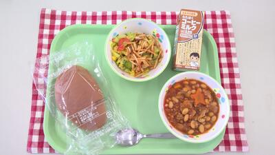 今日の給食は、黒パン、コーヒーミルク、チリコンカン、せん切りおじゃがのサラダでした。
