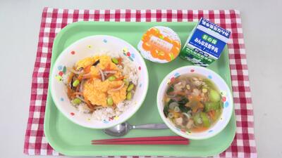 今日の給食は、天津飯、牛乳、春雨スープ、みかんゼリーでした。