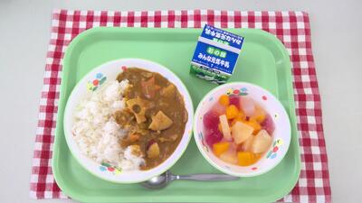 今日の給食は、冬野菜カレーライス、牛乳、フルーツポンチでした。